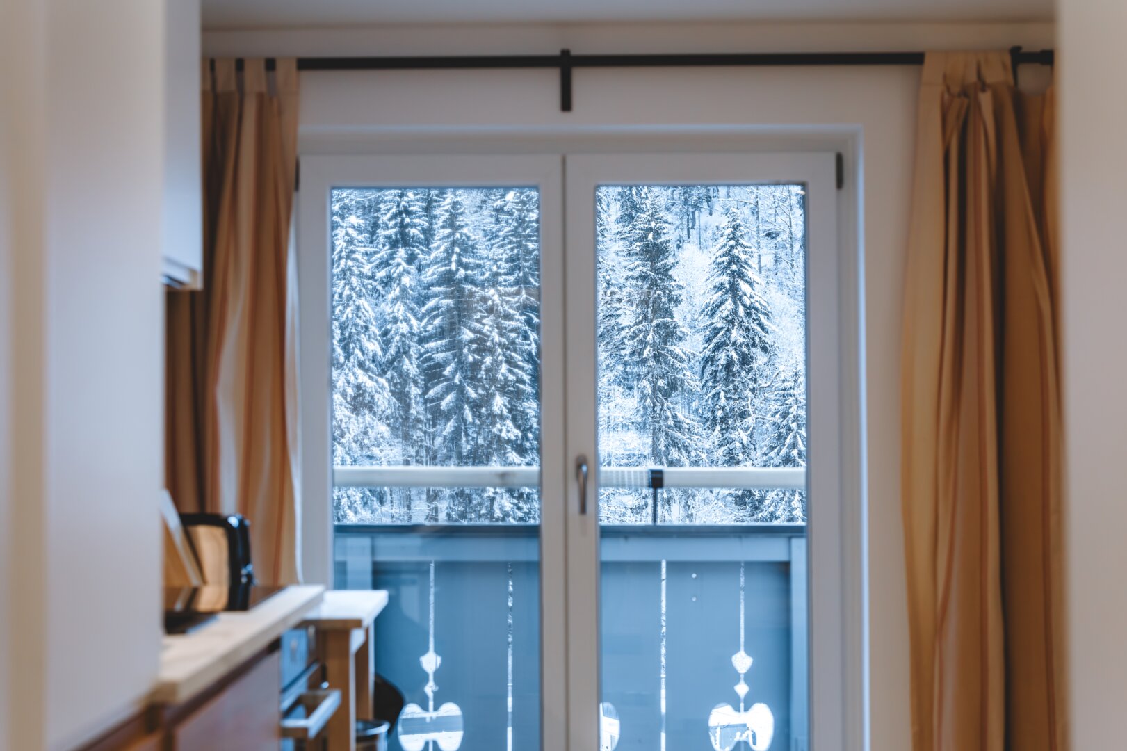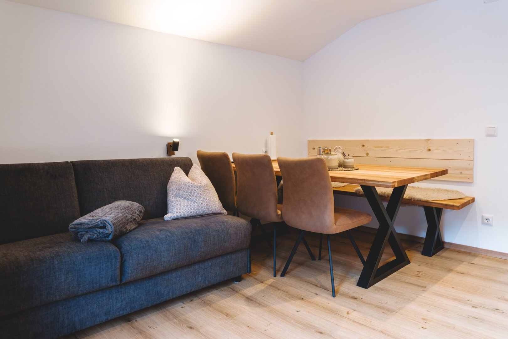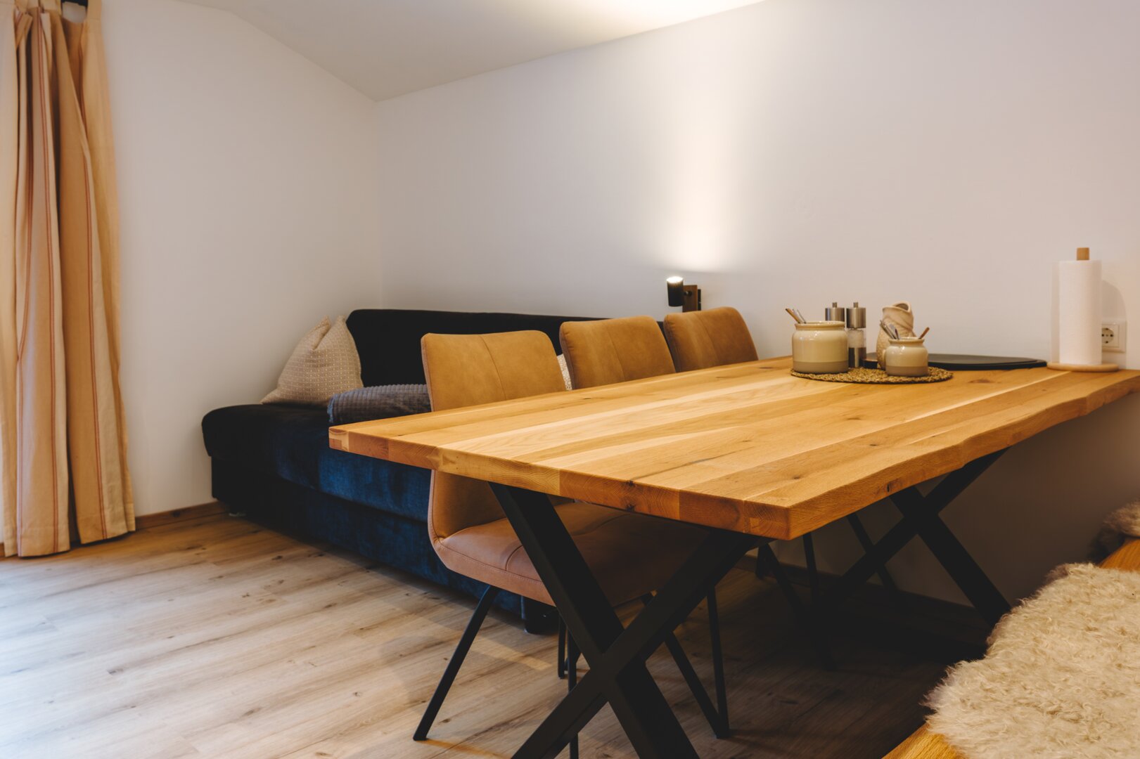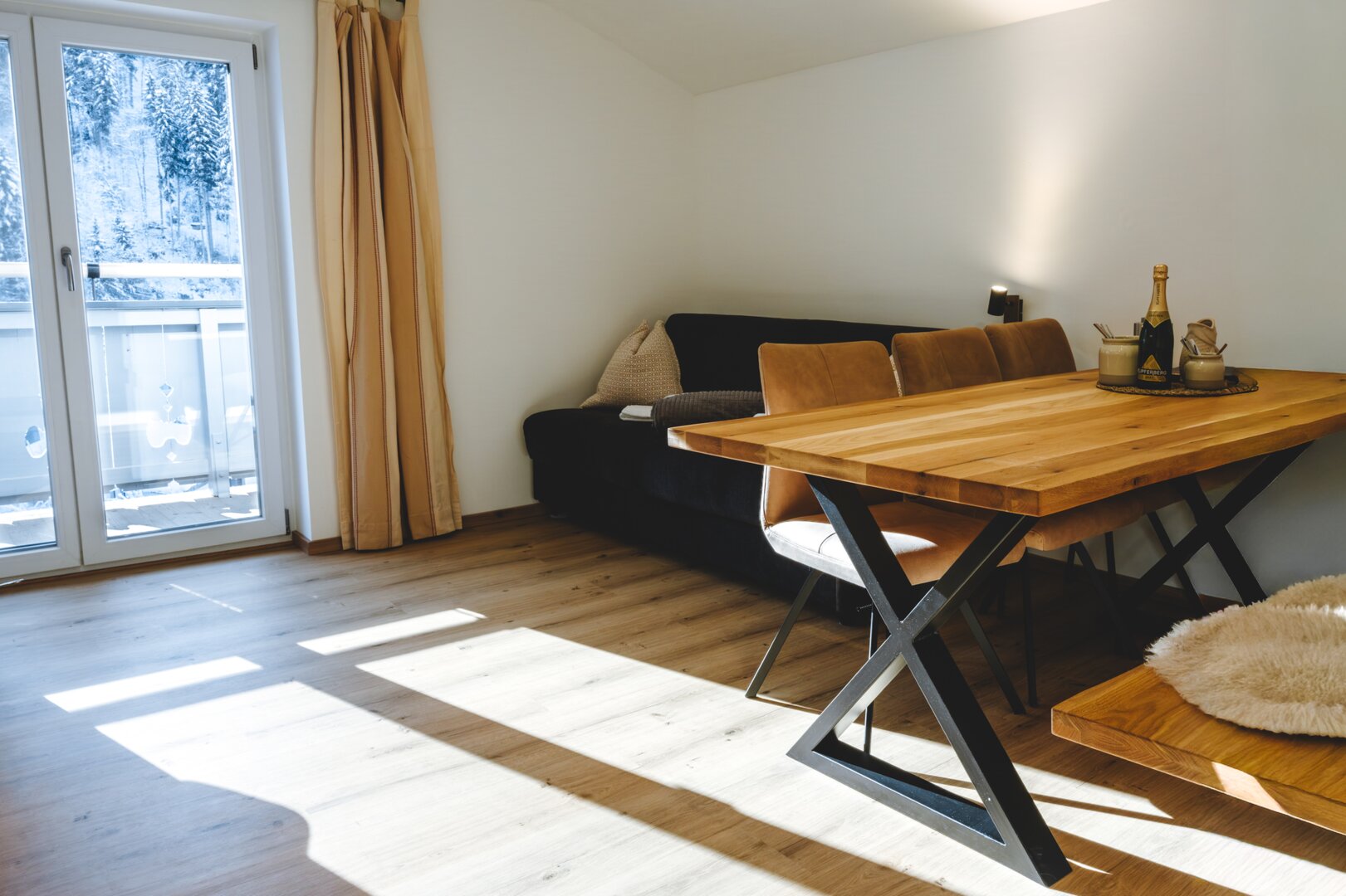 Nach einem aktiven Tag in den Bergen lädt der helle Wohnbereich zum Entspannen ein. Genießen Sie hier den schönen Blick in die umliegende Natur und lassen Sie den Urlaubstag in ruhiger Atmosphäre ausklingen.